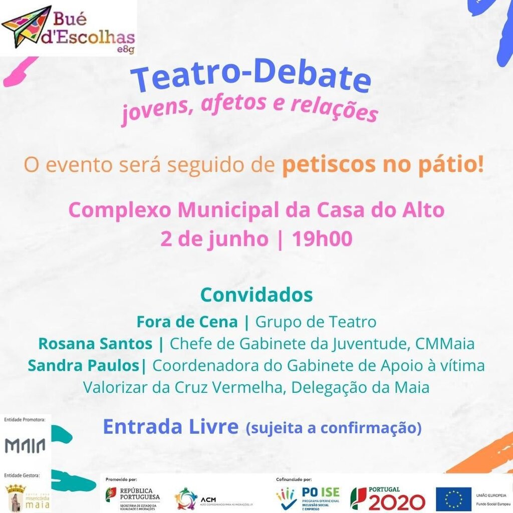 O projeto “Bué d`Escolhas – E8G”, promovido pela Câmara Municipal da Maia e coordenado pela Santa Casa da Misericórdia da Maia, irá organizar no próximo dia 2 de junho, pelas 19:00 horas, o Teatro-Debate sobre a temática “Violência no Namoro e nas relações afetivas entre os jovens”, na Casa do Alto, em Pedrouços.