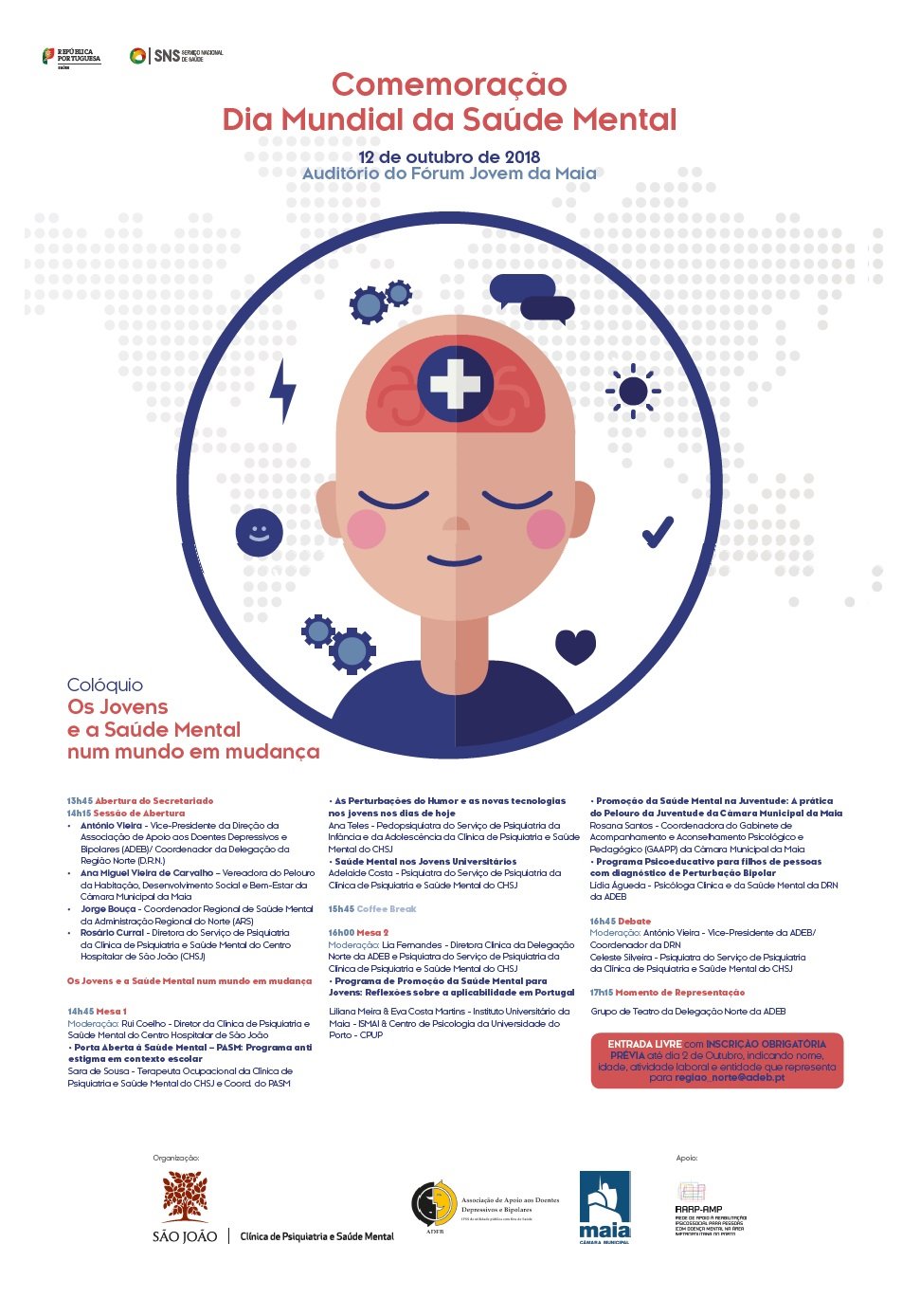 No âmbito das Comemorações do Dia Mundial da Saúde Mental (DMSM), a ADEB DRN – Delegação da Região Norte, em parceria com Câmara Municipal da Maia e a Clinica de Psiquiatria e Saúde Mental do Centro Hospitalar São João, realizaram um colóquio subordinado ao tema “Os jovens e a Saúde Mental num mundo em mudança” no Auditório do Fórum Jovem da Maia, no passado dia 12 de Outubro | 2018, a partir das 13h45m.