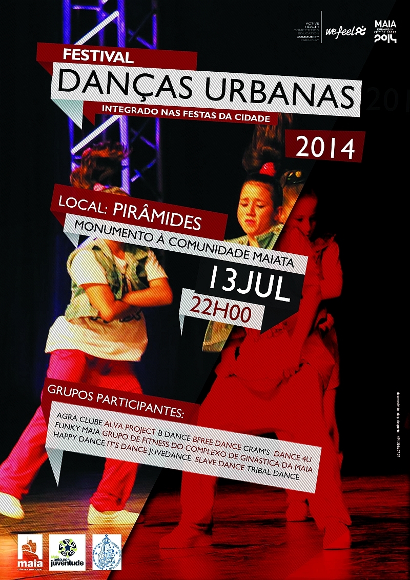 Inserido no programa Maia, Cidade Europeia do Desporto 2014, a cidade recebe, a 13 de julho, o Festival de Danças Urbanas, num evento que conta com a presença de 250 dançarinos e que pretende cativar novos públicos para a prática desportiva ao promover a expressão artística implantada nos movimentos culturais juvenis e ao demonstrar a qualidade e o que de melhor se faz no concelho na área das danças urbanas, no palco do Monumento à Comunidade Maiata (Pirâmides da Maia).