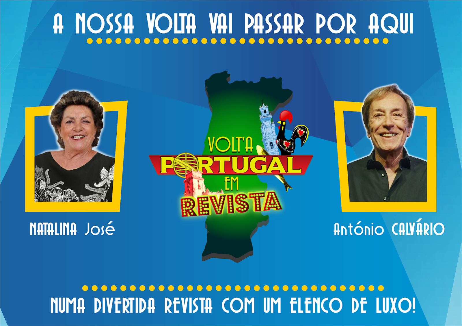 Após 2 revistas com Florbela Queiroz, “Sonhos em Cena” apresenta uma nova e divertida revista onde a graça e o luxo estão de mãos dadas. “VOLT'A PORTUGAL EM REVISTA” é uma aposta no regresso aos palcos de António Calvário, ícone maior da música popular portuguesa, e NATALINA JOSÉ, nome sonante do Parque Mayer. A seu lado, um jovem e talentoso elenco que dá vida a personagens de crítica social e política, em constante atualidade.