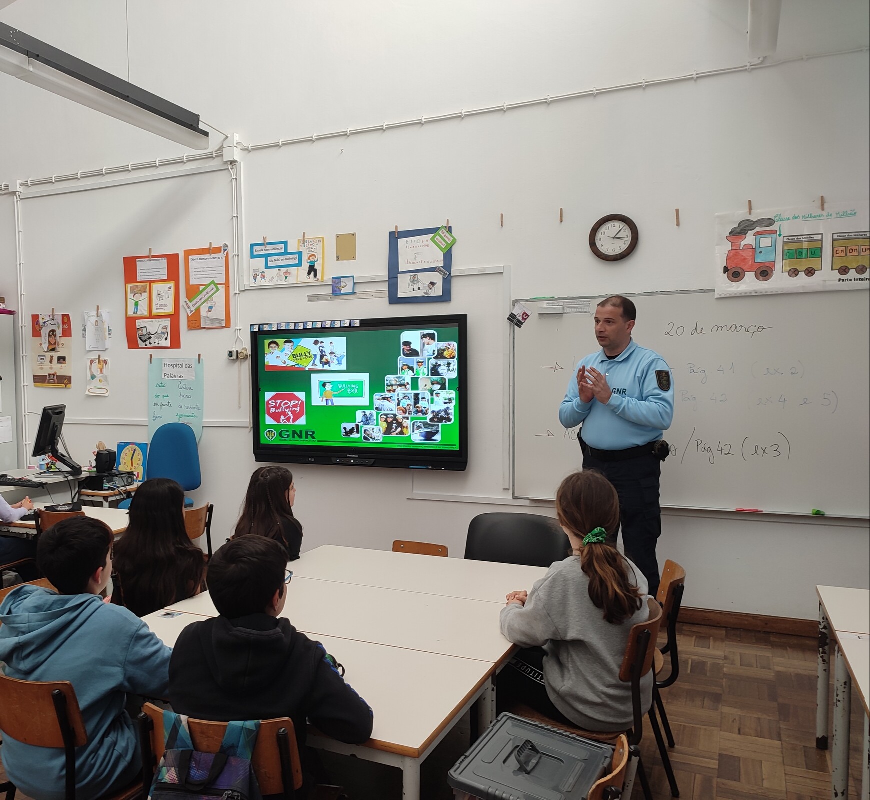 Os agentes explicaram aos alunos as diferenças entre Bullying e Cyberbullying, quais as consequências da sua prática, como podem proteger-se e quais os comportamentos adequados para a utilização segura e correta das redes sociais e das novas tecnologias.