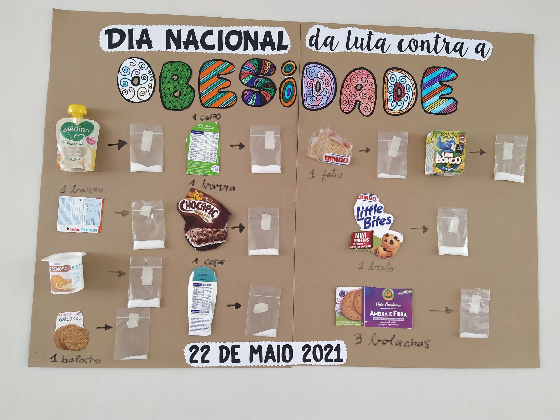 A abordagem ao tema foi feita pela professora pedindo aos seus alunos que recolhessem algumas das embalagens dos produtos que mais costumam consumir e assim realizou-se uma exposição de alerta geral para o tema da obesidade infantil.