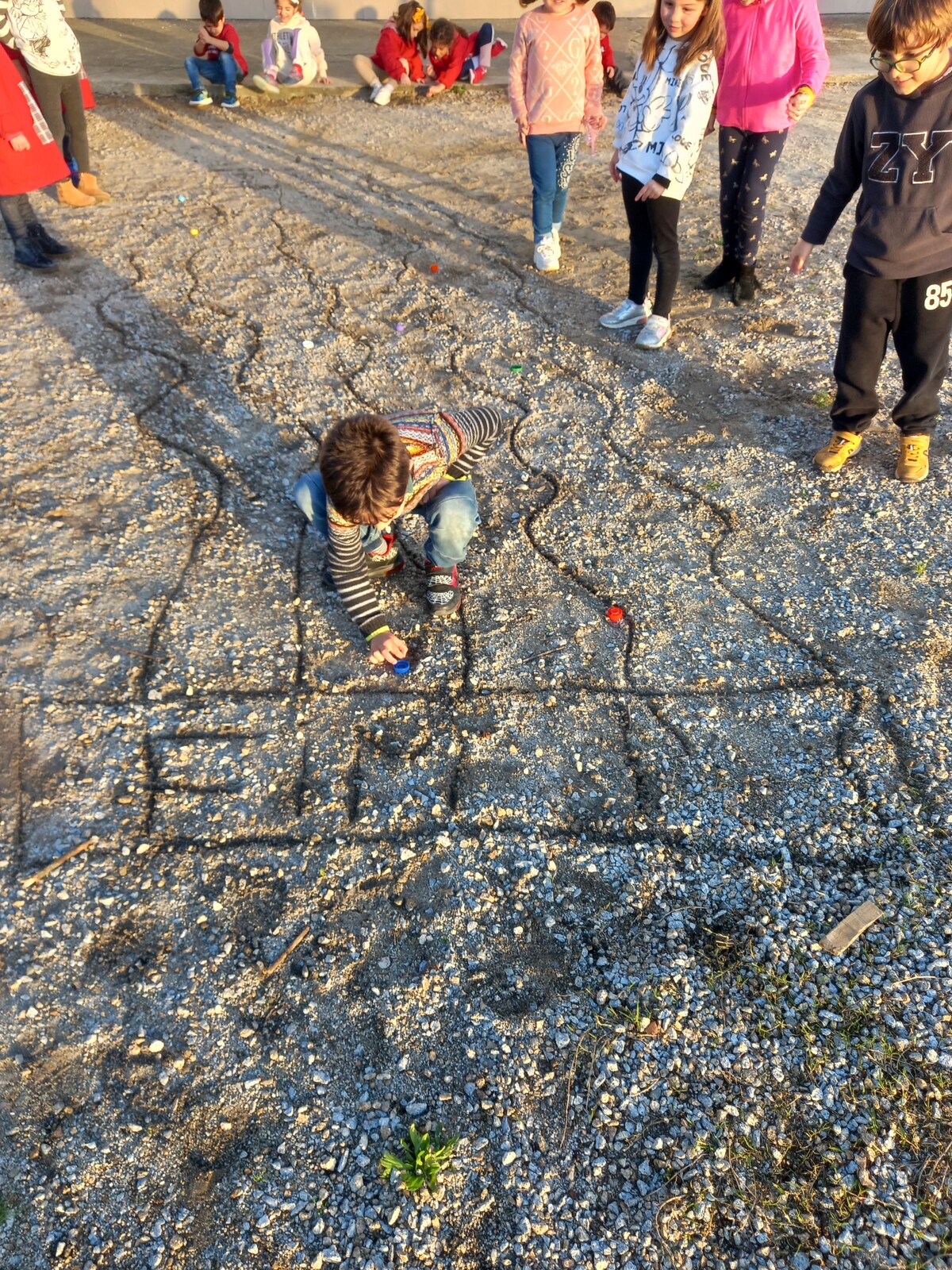 Nas suas palavras, descreve “Fizemos o jogo tradicional da Carica, um jogo dos tempos dos pais e avós das crianças. Inicialmente desenhei uma pista no chão e cada um escolheu uma carica para jogar. Com o dedo, atiravam a carica para a frente, sem que esta saísse da pista. Ganhou quem chegou á meta em primeiro lugar. O jogo foi realizado no recreio da escola, e foi engraçado ver as crianças a jogarem individualmente, mas ao mesmo tempo a ajudarem-se mutuamente no sentido de verbalmente darem sugestões de como deviam fazer. - Joga devagar porque senão a carica sai da pista!! Nesta atividade o importante foi dar a conhecer o jogo de outros tempos.”