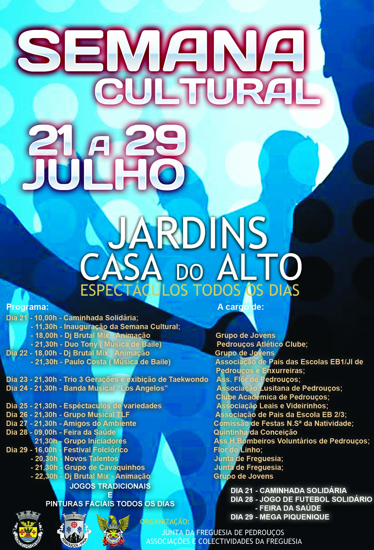 A Junta de Freguesia de Pedrouços leva a efeito, pelo segundo ano consecutivo, a Semana Cultural, a decorrer nos jardins do Complexo Municipal da Casa do Alto, entre os próximos dias 21 e 29 de julho.